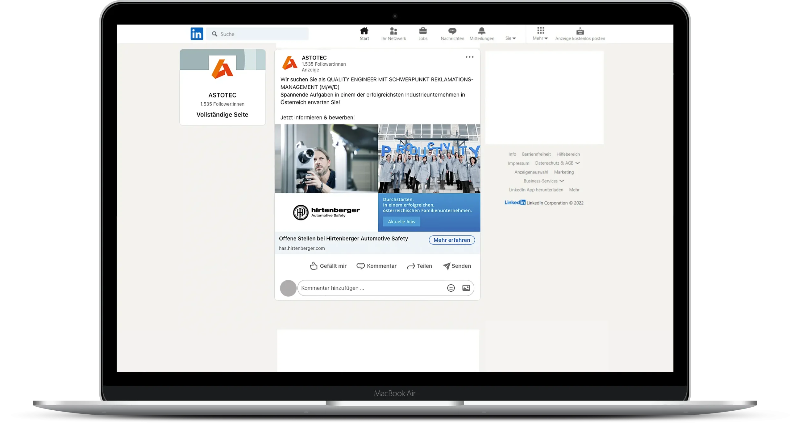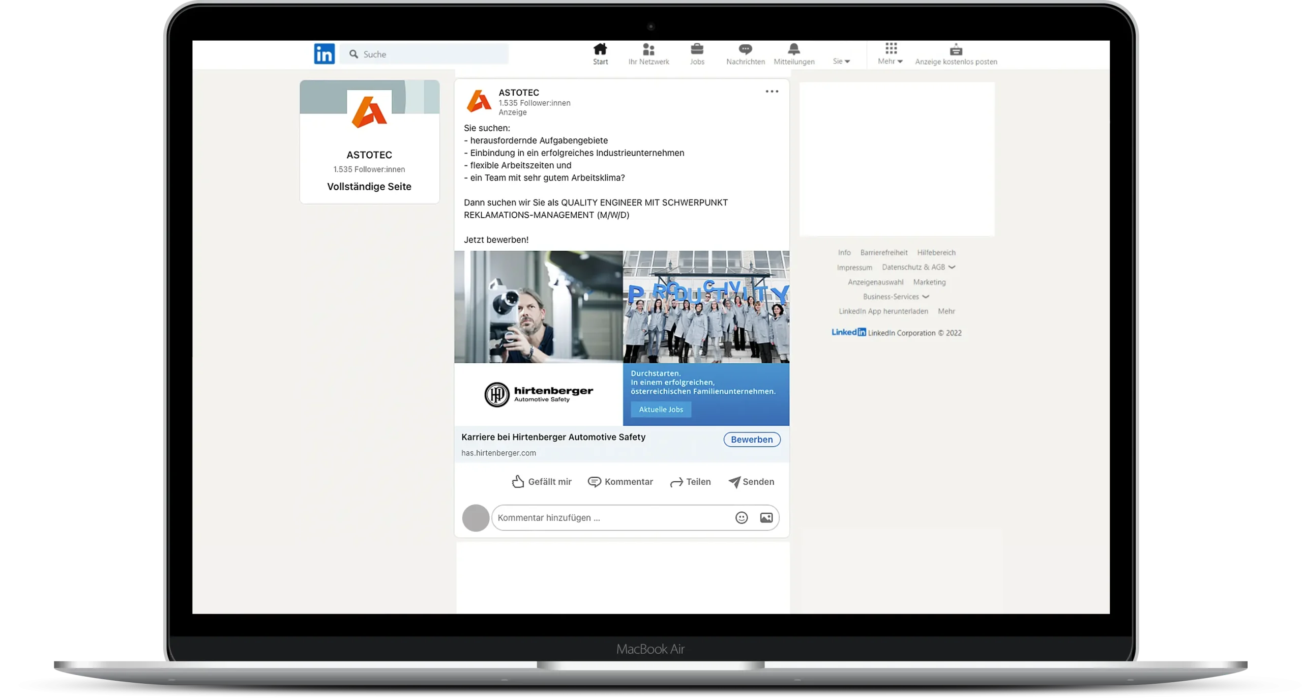 Im Laufe der Zusammenarbeit konnte eine stetige Bespielung der Social Media Kanäle Facebook und LinkedIn mit Inhalten rund um die Themen Mitarbeiter und Informationen zu ihren Produkten etabliert werden. Die laufenden Werbekampagnen verfolgen das Ziel, Sichtbarkeit und Reichweite zu schaffen und ASTOTEC als attraktiven Arbeitgeber in der Region bekannt zu machen.